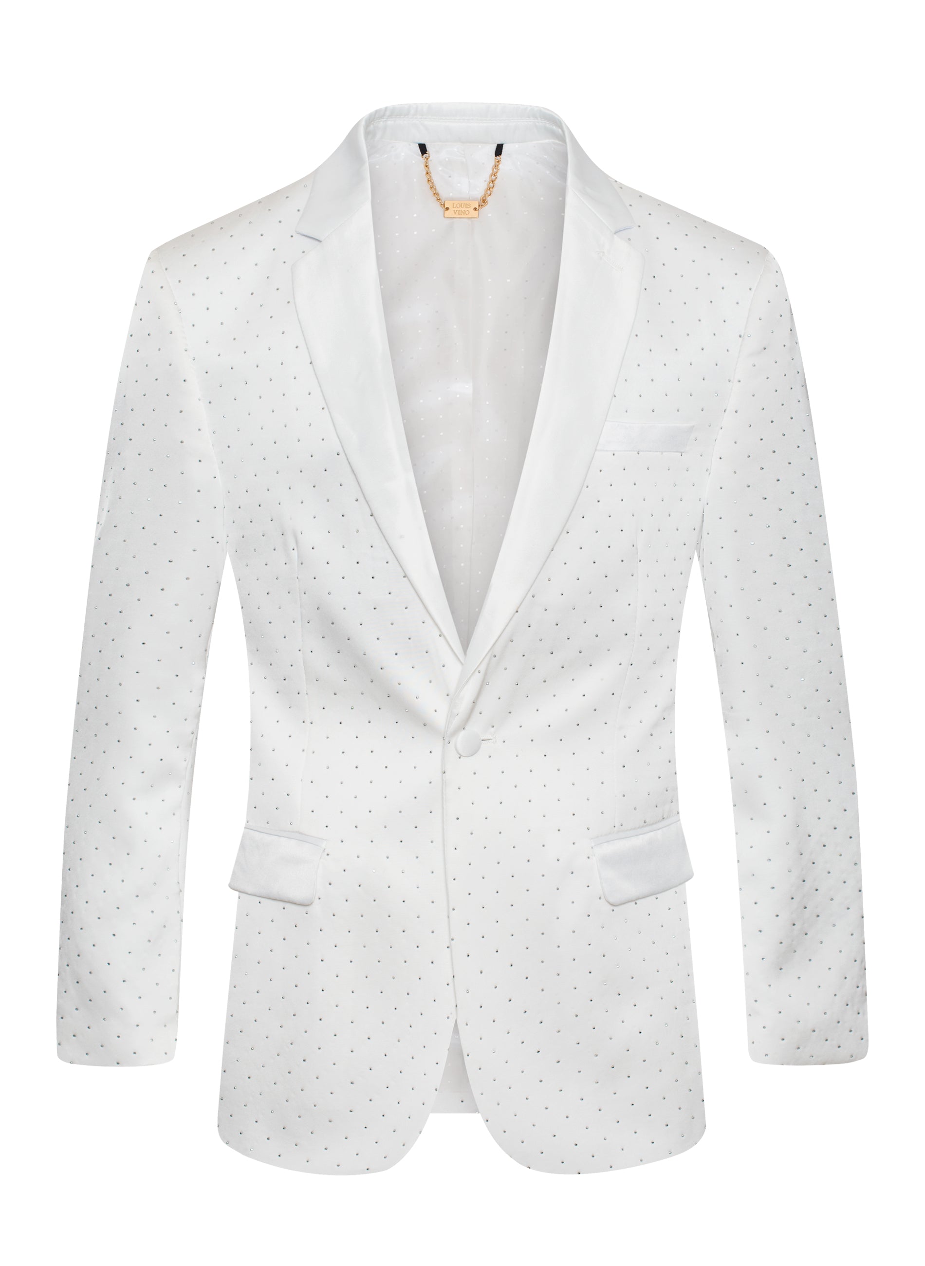 Luxurious and eye-catching piece designed to dazzle and impress. This blazer is adorned with meticulously placed rhinestones that shimmer with every movement, making it perfect for those who want to make a bold fashion statement. Crafted from high-grade polyester, cotton, and spandex, the rhinestones are subtly integrated into the fabric and densely clustered for a more dramatic effect.