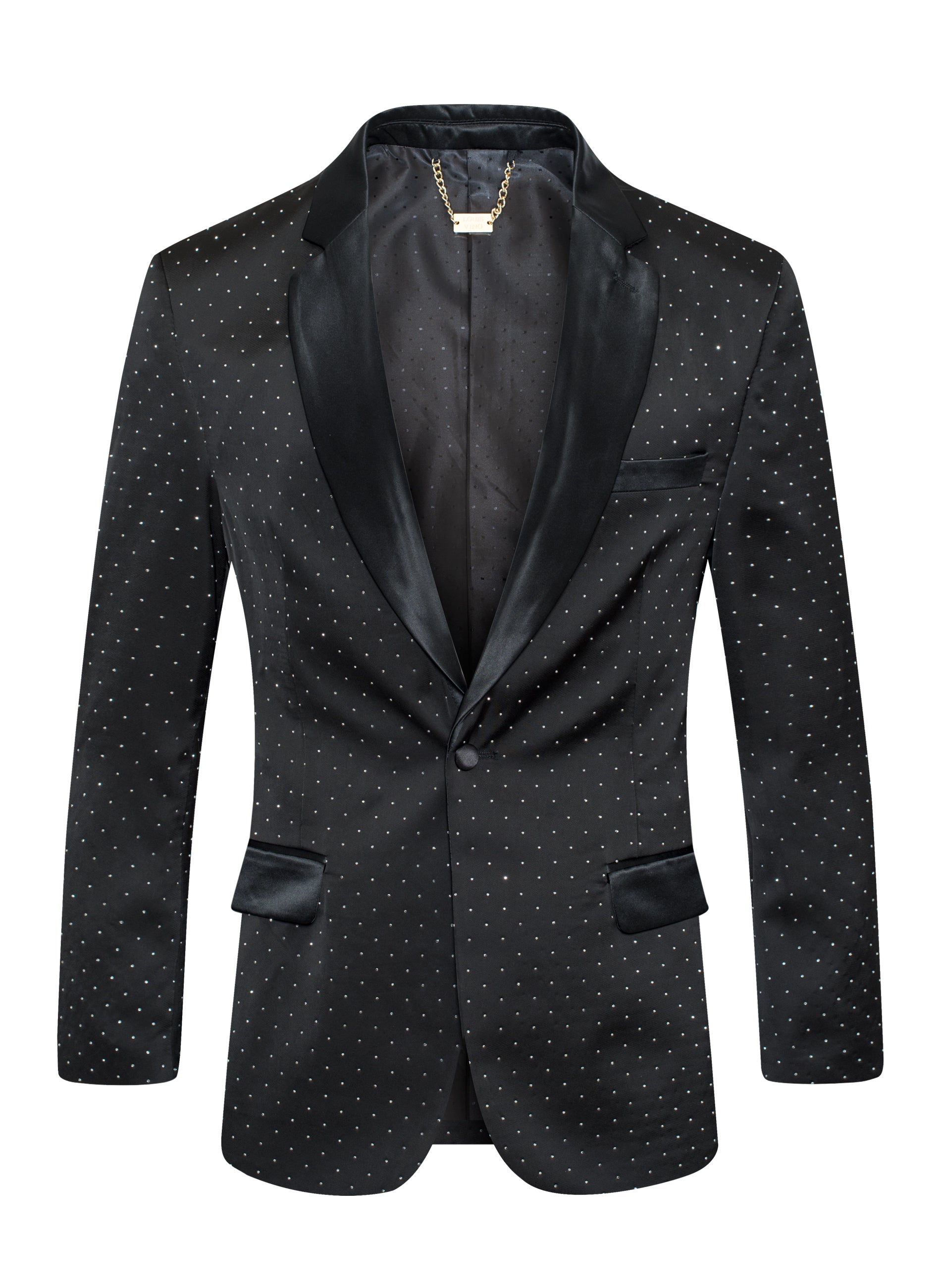 Luxurious and eye-catching piece designed to dazzle and impress. This blazer is adorned with meticulously placed rhinestones that shimmer with every movement, making it perfect for those who want to make a bold fashion statement. Crafted from high-grade polyester, cotton, and spandex, the rhinestones are subtly integrated into the fabric and densely clustered for a more dramatic effect.